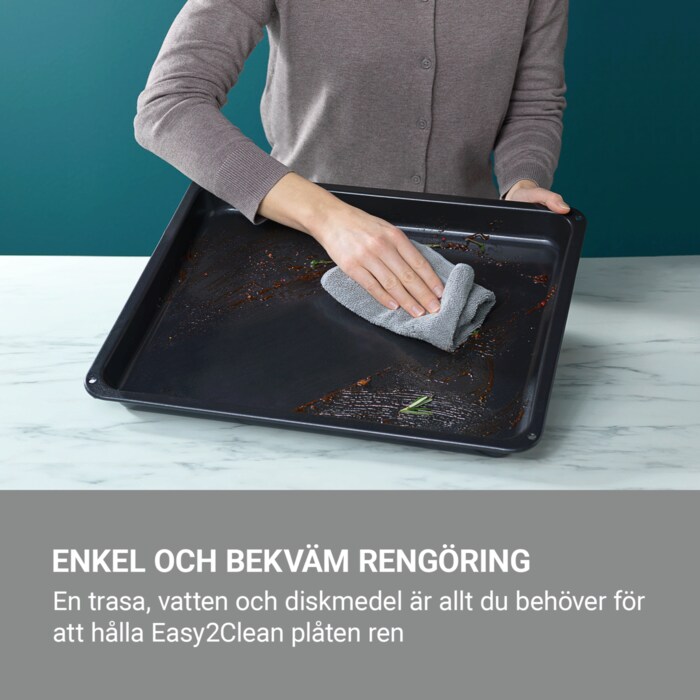 Placera maten direkt på den djupa Easy2Clean-plåten. Keramisk beläggning gör att maten inte klibbar fast på plåten, vilket minskar behovet av bakplåtspapper eller extra olja. Den är enkel att rengöra – en våt trasa, varmt vatten och lite diskmedel är det som krävs.