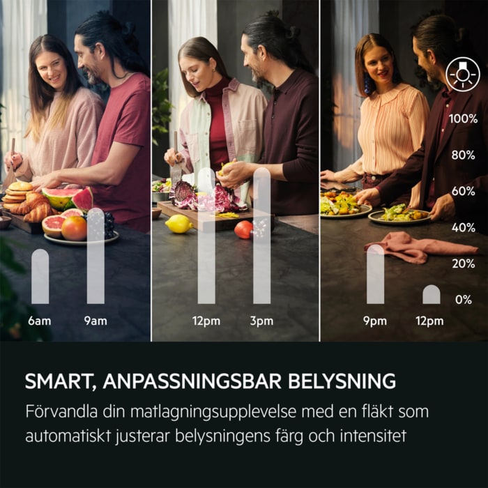 Fläkten 8000 Perfect Illumination lyfter fram varje ingrediens magiska färger. Den justerbara belysningen lyser upp din spishäll och gör det möjligt för dig att individanpassa din köksbelysning för att spegla ditt humör.