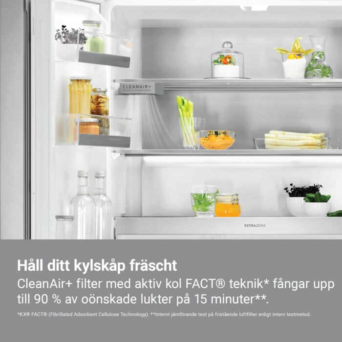 Håll kylskåpet fräscht med CleanAir+ filter med FACT®-teknologi. Genom aktiv kol FACT®-teknologi*, som är framtagen med naturligt kol, kan 90 % av oönskade lukter fångas upp inom 15 minuter**.