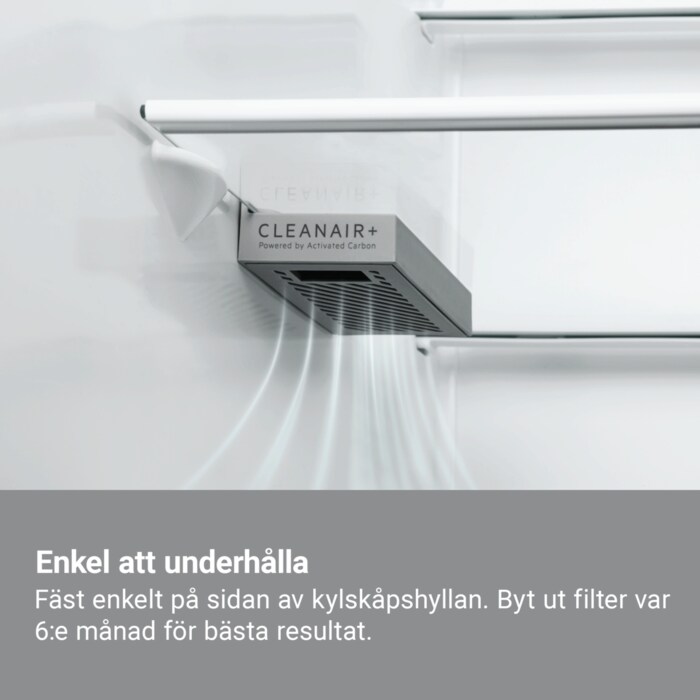 Vårt CleanAir+ Filter använder aktivt kol FACT®-teknologi* för att ta bort upp till 90% av dålig lukt på bara 15 minuter**. Denna förpackning innehåller en hållare och ett filter. Klicka bara fast den på på sidan av en hylla på ett AEG /Electrolux kylskåp. För bästa resultat rekommenderar vi att du byter ut det var 6:e månad.