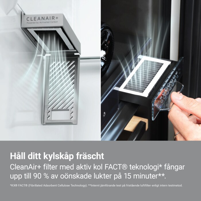 Håll ditt kylskåp fräscht tack vare CleanAir+-filtret med FACT-teknologi®. Med hjälp av FACT-teknologi® med aktivt kol* som utvecklats från naturligt träkol fångas upp till 90 % av lukterna upp på 15 minuter**.