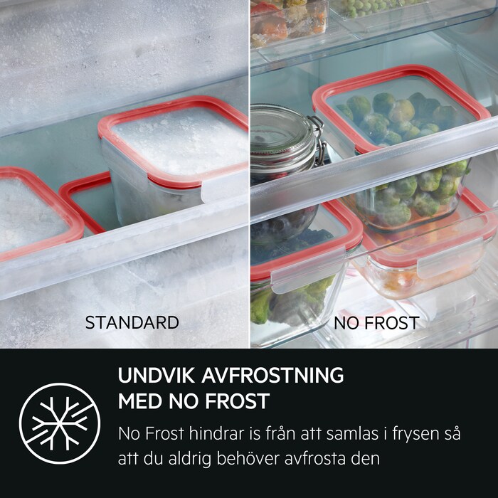 No Frost förhindrar att is bildas i frysen. Prestanda äventyras aldrig och din mat bevaras bättre än någonsin.