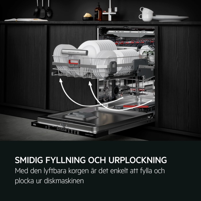 ComfortLift® lyfter en fylld korg 25 cm för att göra det enklare och snabbare att fylla och tömma diskmaskinen. När du drar ut den nedre korgen lyfts den smidigt upp till samma nivå som den övre, tack vare specialdesignade gångjärn.