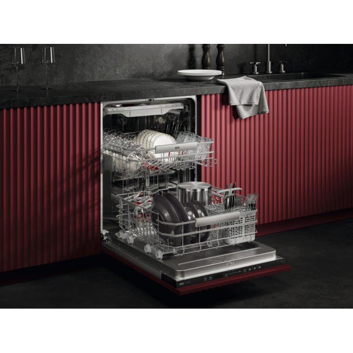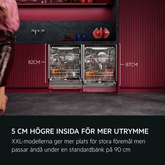 9000 XXL: 5 cm högre inuti men får ändå plats under köksbänkar i standardhöjd. Multifunktionella korgar med grepp för glas och plåtar. Kraftfull rengöring avlägsnar fastbrända matrester. Högeffektivt vattensystem som använder så lite som 8,4 liter vatten.