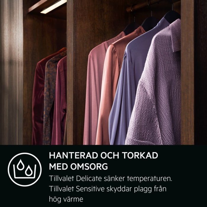 Torktumlaren 8000 AbsoluteCare® kontrollerar rörelsen och temperaturen i trumman, vilket garanterar att ylle inte krymper och att silke inte förlorar sin form. AbsoluteCare® återställer vattenavvisningen för funktionsplagg och är certifierad med Woolmark Blue.