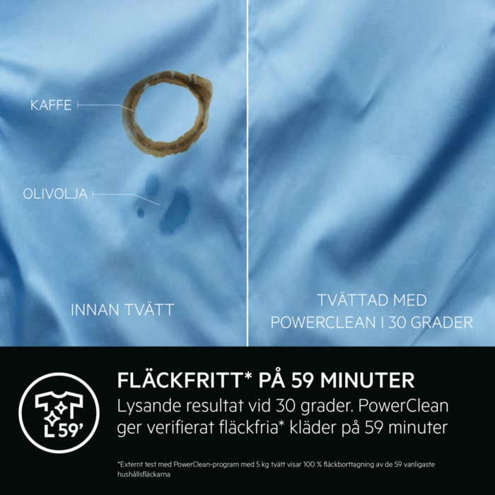 Externt test av PowerClean 59 min-programmet i 30 °C-gradigt vatten med 4 kg tvättmängd visar en 100-procentig borttagning av de 50 vanligaste hushållsfläckarna.