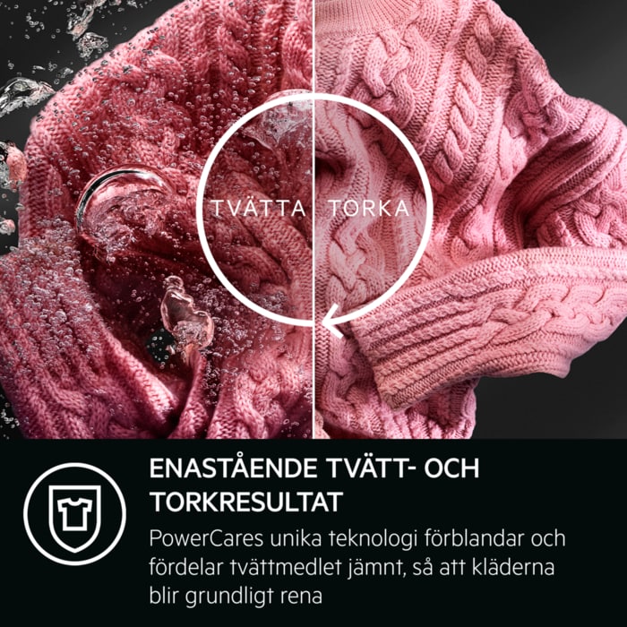 Tvätt-torken 8000 PowerCare förblandar tvättmedlet med vatten och fördelar det jämnt över dina kläder för ett märkbart bättre tvättresultat. Genom att aktivera tvättmedlet redan vid 30° får du ett överlägset tvättresultat på mindre än en timme. Plaggen torkas skonsamt vilket gör att de behåller sin form och känsla.