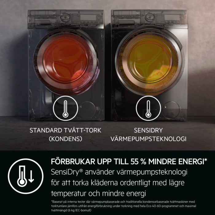* Baserat på interna tester jämförande lufttrummans maximala inloppstemperatur för tvätt-tork med värmepump och traditionell kondensor*** Baserat på interna tester, jämförande tvätt-tork med värmepump och traditionell kondensor energiförbrukning av torkfas med full Eco 40-60 cykel vid maximal belastning (6 kg IEC-bomull).