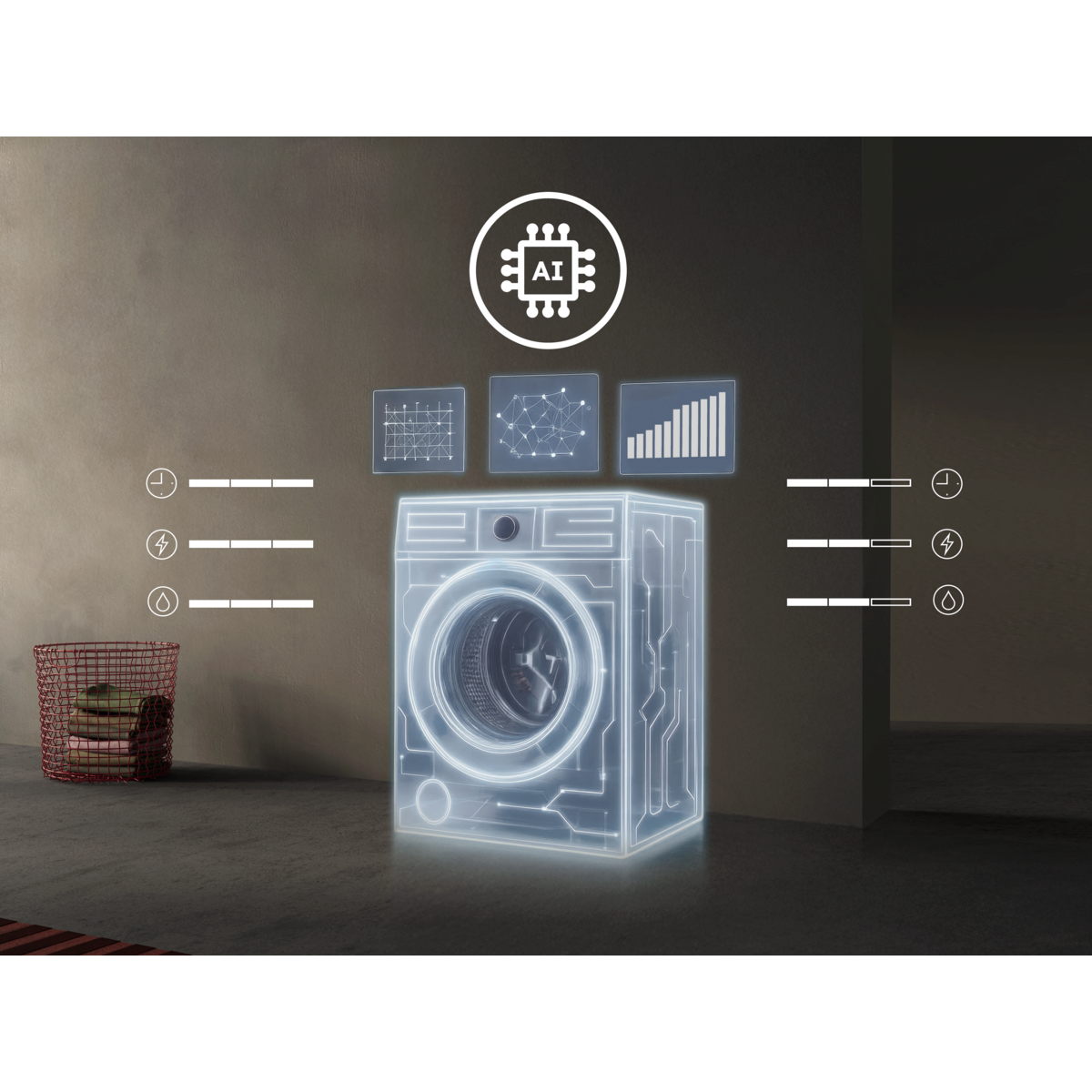*Baserat på en algoritm för tvättmängdsavkänning som är förtränad på olika typer av tvätt. Ingen användardata används för att vidareutbilda AI:n. **Internt test av tids-, vatten- och energiförbrukning för ett 30 °C bomullsprogram optimerat med AI WashAssist för 1 kg jämfört med maximal tvättmängd.