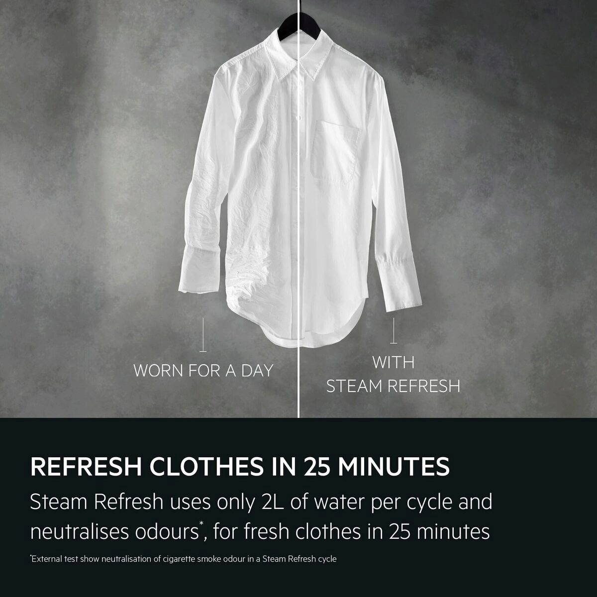Att ånga istället för att tvätta är ett snabbt och skonsamt sätt att fräscha upp kläder som inte behöver en full tvätt. Tvättmaskinen 7000 ProSteam® har en ångfunktion för att fräscha upp kläder som bara förbrukar 2 liter vatten per cykel.