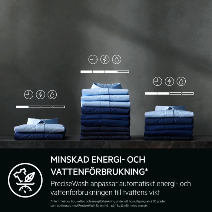 *Internt test för tid, vatten- och energiförbrukning i en bomullscykel i 30 °C, optimerad med PreciseWash för en 1 kg tvätt jämfört med maximal tvättmängd.